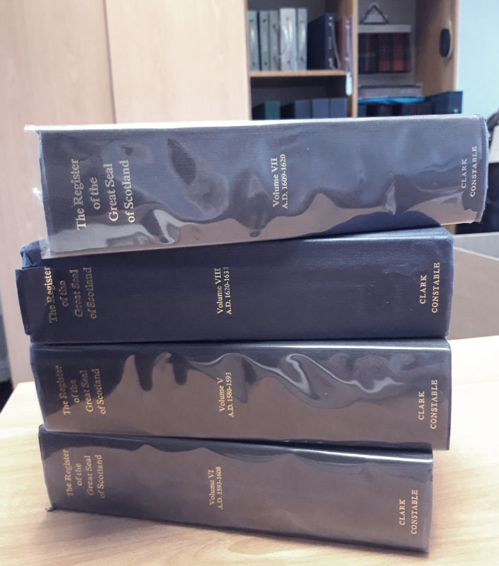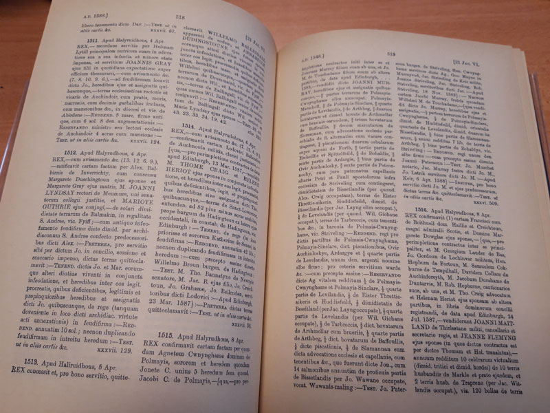 The printed records of the Register of the Great Seal of Scotland. In theory, as all land in Scotland was owned by the king, and only ‘held’ from him by everyone else, any land transaction had to be approved in a charter (basically a receipt), made official by the king’s great seal. These records aren’t for the feint hearted. They are all in Latin and, like any bureaucratic paperwork, can often be quite tedious to follow.