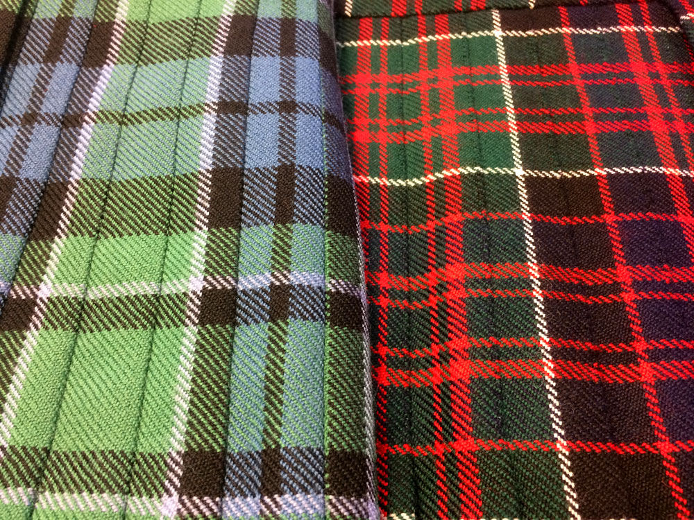 Above you can see a machine-stitched kilt on the left, and a completely hand-stitched kilt on the right. What’s the difference? Both have their own advantages. Both are made in the same way: it’s just that the former uses a sewing machine to finish, while the latter each stitch is done by hand.