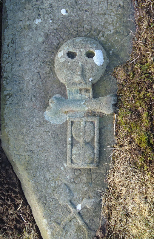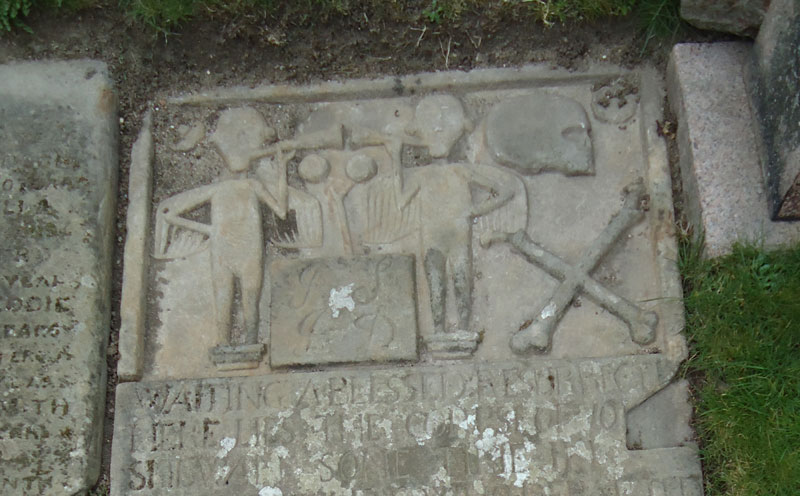 An early tombstone from Fetteresso Old Kirk, showing Skull, bone, hourglass and crossed axe and spade.