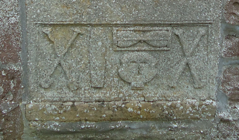 A wall tomb from Longside Old Kik, showing cross spades, coffin, hourglass, skull and crossbones
