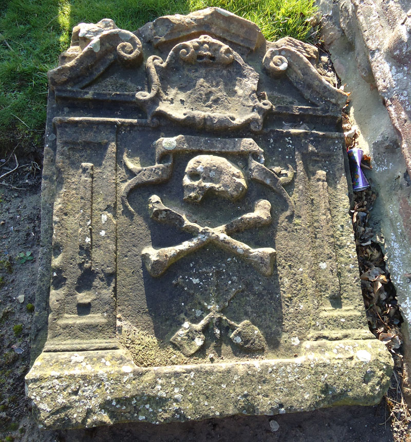 A later standing tombstone from Peterhead Old Kirk, showing skull and crossbones, and crossed spade and shovel.