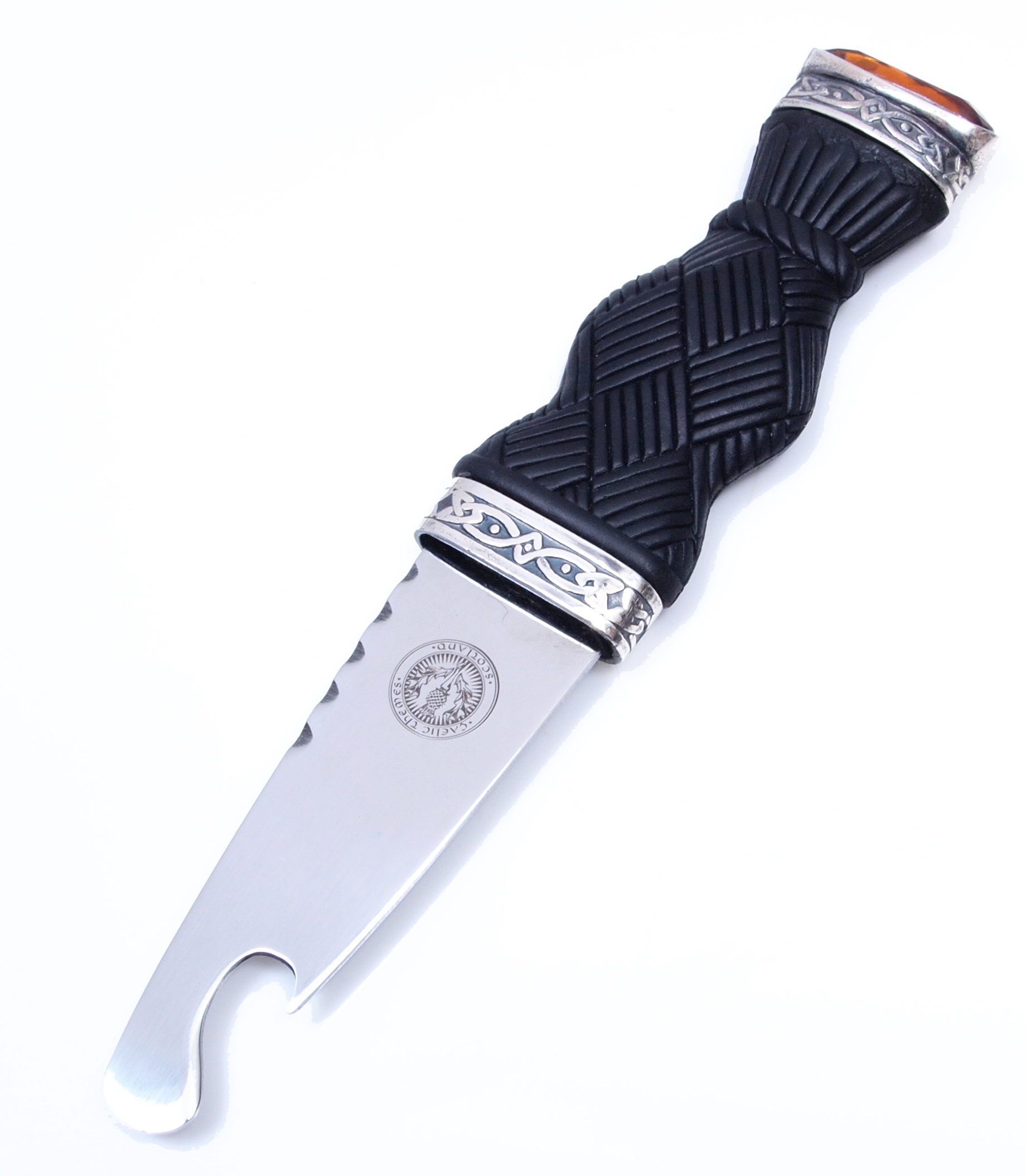 So where does this leave us today? Well, the bladed Sgian Dubh is usually just carried as a ceremonial ornament as part of the tradition of the highland wear, and we offer these in several varieties. But on top of this, we have tried to update this tradition in two ways, to make versions of the Sgian Dubh that can be useful, as it originally was. First, we have the Sgian Brew. Instead of a sharp blade, we have a bottle opener, but otherwise entirely in the form of a traditional Sgian dubh.