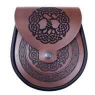 A full brown leather day sporran, with embossed Celtic knot design and knotted leather tassels.